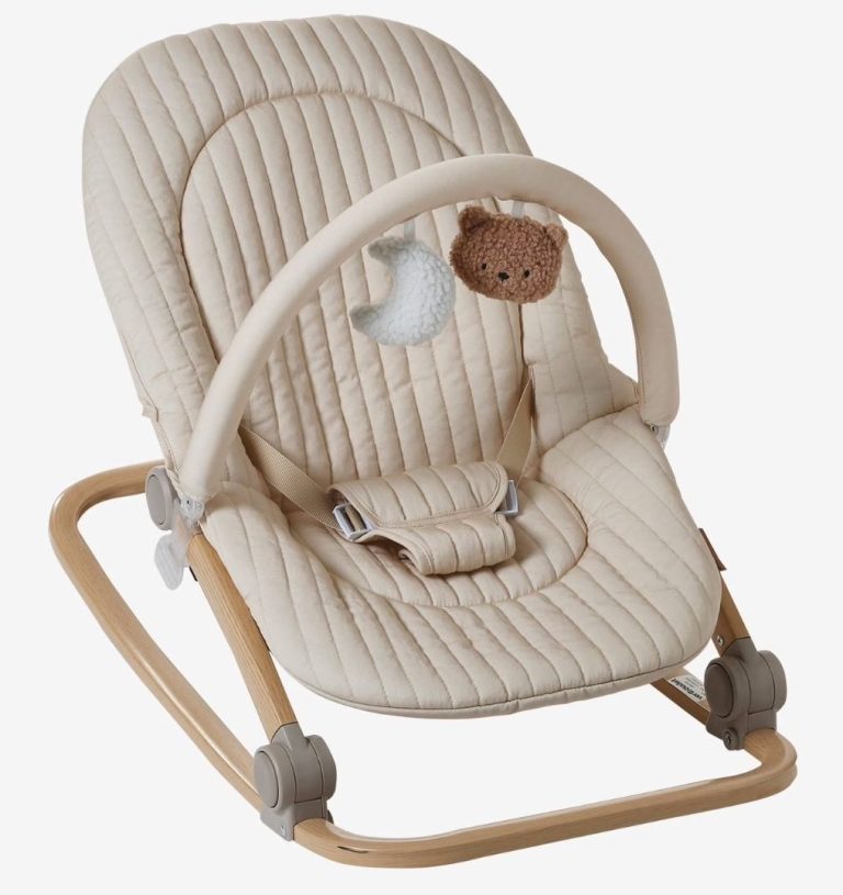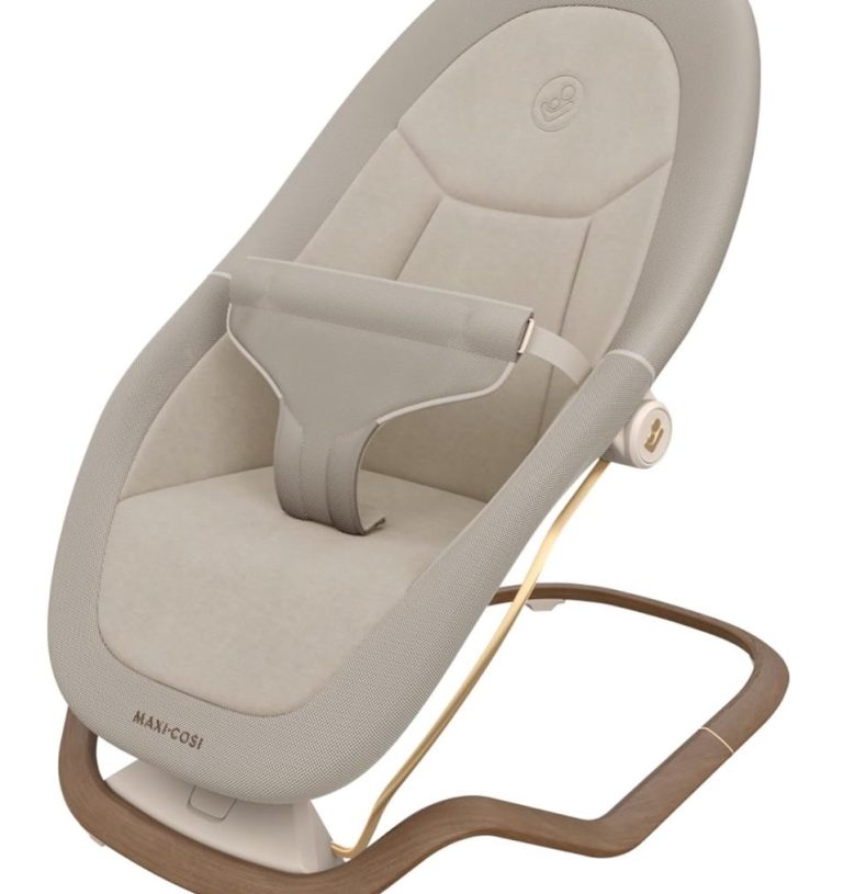 Deze baby wipstoel heeft een stijlvol ontwerp met moderne lijnen, een elegant houteffect en luxueus zachte gerecyclede stoffen.